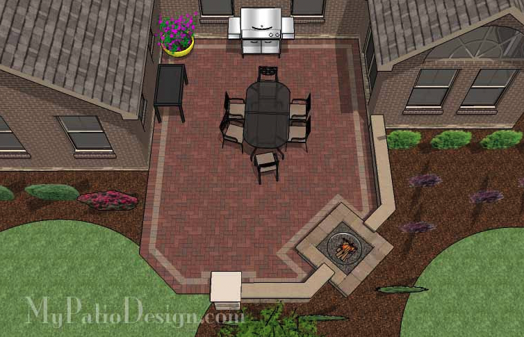 Create a variety of entertaining nooks with this enticing courtyard design that’ll have you spending most of your time outdoors. A curved seating area works great with an added fire pit while another area separates the dining and grilling area from conversational seating. Add shade with an umbrella and accentuate your new patio with elegant landscaping for a space you’ll love.